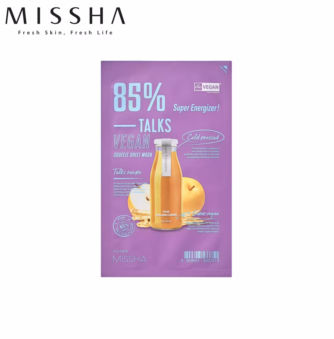 MISSHA Talks Vegan Squeeze Sheet Mask Super Energizer är ett veganskt recept där man använder ett gyllene snitt av Super Foods för att skydda irriterad hud från yttre miljöfaktorer. Super Energizer använder päron och extrakt från den speciella örten/blomman "Praktklocka" för att återfukta huden för en glänsande finish och ge näring till ett utmattat och torrt utseende.