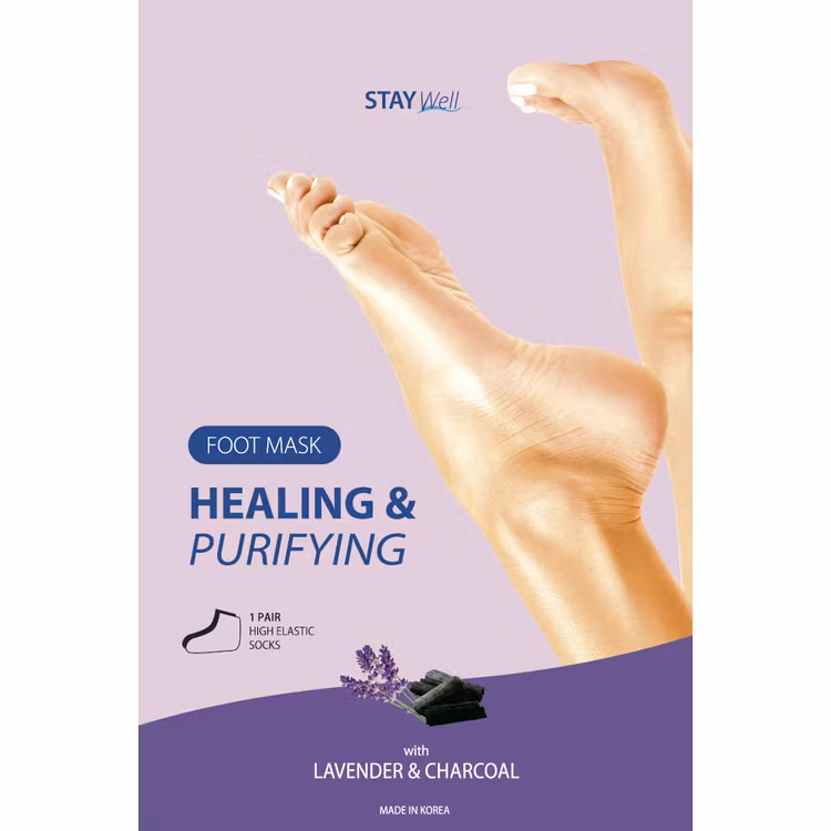 STAY Well Healing & Purifying Foot Mask är berikad med träkol och lavendel för att effektivt ta bort föroreningar, lindra trötta fötter och ge en renare och friskare känsla. Den innovativa tvåskiktsväven är designad för att vara läckagefri, vilket gör att du kan njuta av en behaglig och skonsam behandling. Vår speciella formula återfuktar, avgiftar och lindrar utan att kladda, vilket gör dina fötter mjuka och fräscha. (26 cm på längsta stället.)