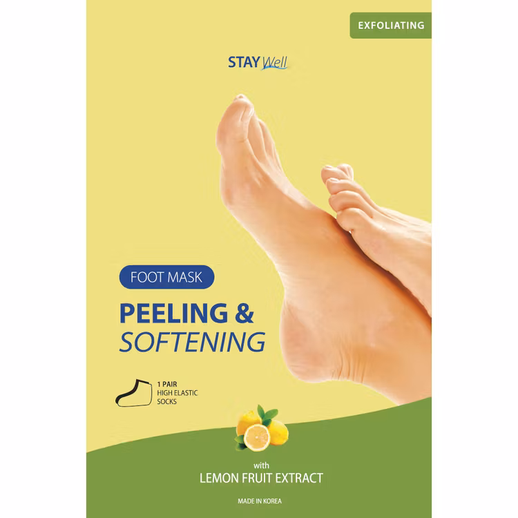 STAY Well Vegan Peeling & Softening Foot Mask är ett par exfolierande sheet masks som effektivt tar bort förhårdnader och gör dina fötter mjuka och lena. Maskernas läckagefria design och elastiska tvåskiktsväv ger en behaglig och bekväm behandling. Rika botaniska extrakt som citron, apelsin, teoljebuske, och honung exfolierar skonsamt, medan kokosnötsolja lindrar och återfuktar den nyexfolierade huden. (28,5 cm på längsta stället)