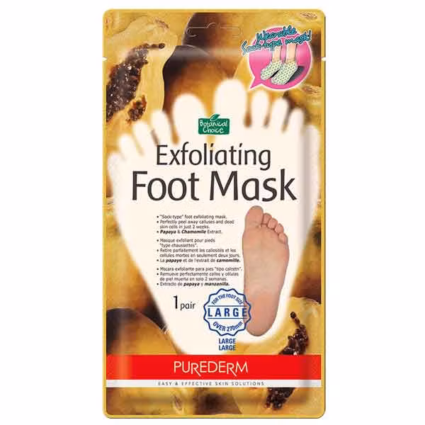 PUREDERM Exfoliating Foot Mask är fotpeeling plus behandling i form av en bärbar sheetmask. Sätt på masken som om du sätter på dig ett par sockor. Den tar bort alla förhårdnader över tid och ger ett synligt mjukgörande resultat inom två veckor. Papaya, citron, äpple, apelsin och andra naturliga ingredienser tar bort förhårdnader medan kamomillextraktet vårdar och lugnar den nypeelade huden. (29 cm på längsta stället)