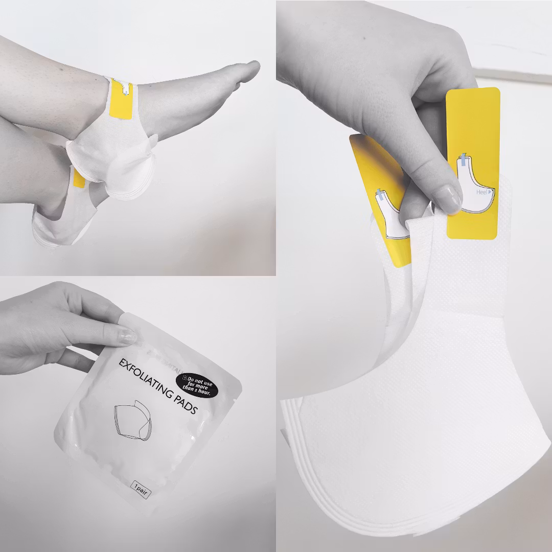 1. Öppna paketet, ta ut den exfolierande lilla dynan och lägg den på hälen i samma riktning som på bilden.