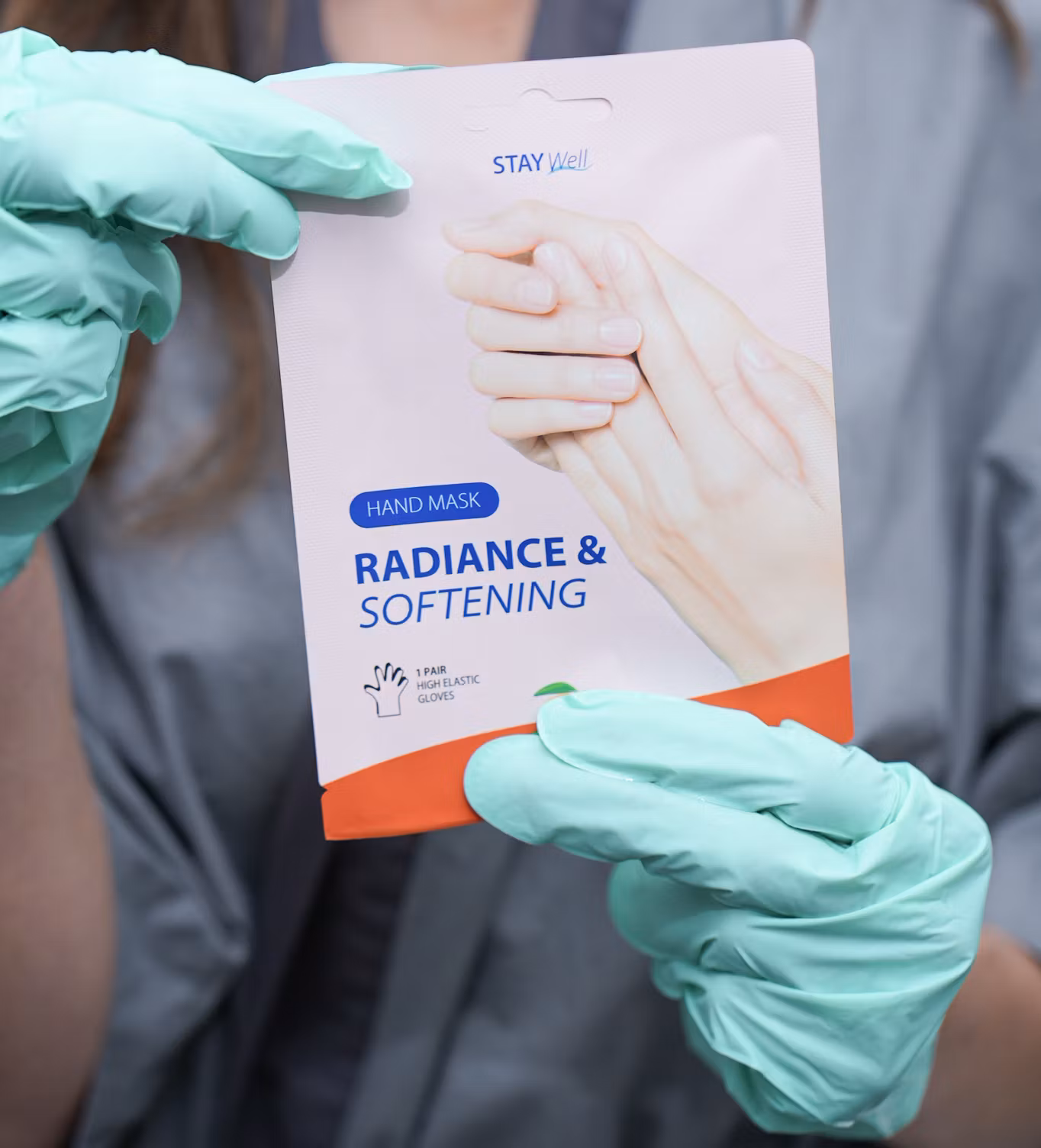 STAY Well Radiance & Softening Hand Mask är en effektiv handmask som ger lindring och näring åt trötta händer. Den läckagefria designen och den elastiska tvåskiktsväven gör den enkel och bekväm att använda. C-vitamin ger lyster och liv till trist hud, medan CT-komplex och olivolja mjukgör grov hud och nagelband, vilket ger händerna en mjuk och fräsch känsla. Denna mask är perfekt för att återställa både hudens och nagelbandens fräschör och ge en uppfriskande, ungdomlig lyster.
